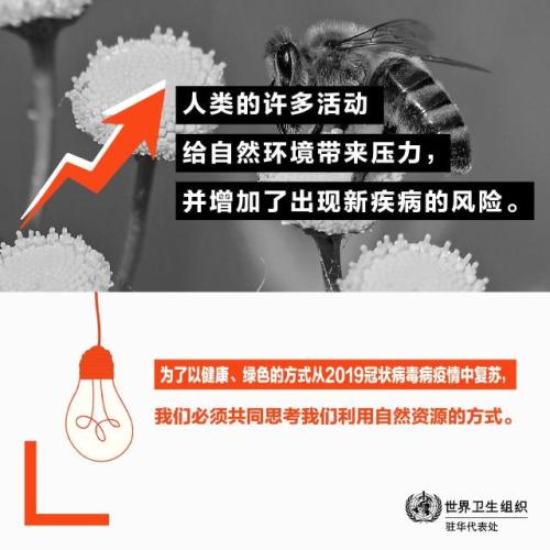 人类的许多活动给自然环境带来压力,从砍伐森林,到密集和污染性的农业实践,再到不安全的野生动物管理和消费。这也增加了人类新发传染病的风险——其中60%以上源自动物,主要来自野生动物。2019冠状病毒病疫情后的总体复苏计划,特别是降低未来流行病风险的计划,需要减少人类对环境的影响,以便从源头上减少风险。