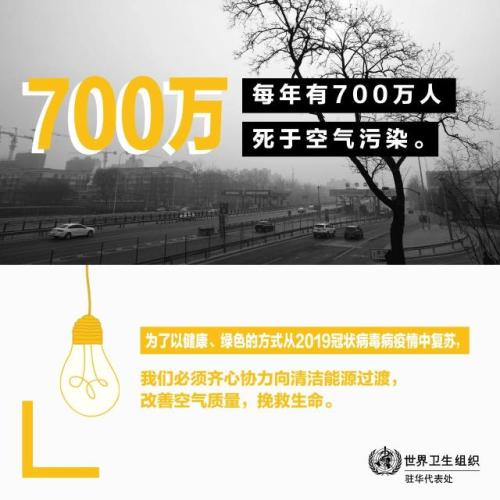 目前,每年有超过700万人死于接触空气污染,占所有死亡人数的八分之一。超过九成人所呼吸室外空气的污染水平已经高于世卫组织空气质量指导值。三分之二的室外污染暴露是由化石燃料燃烧造成的,化石燃料燃烧也驱动着气候变化。