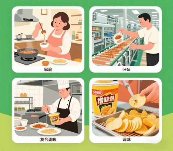常见代表有5'-肌苷酸二钠(IMP)和5'-鸟苷酸二钠(GMP)。其中,呈味核苷酸二钠(I+G)是由IMP和GMP组合而成,通常从酵母中提取。与味精相比,它的增鲜能力更强,并能与味精产生协同作用(俗称“鲜味相乘”),使鲜味更加持久和醇厚,因此常用于方便面、调味料、罐头等食品中。