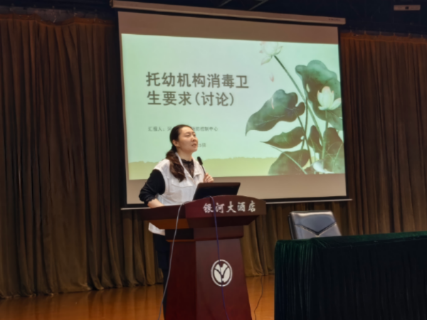 培训会由市疾控中心消杀所消毒科费春楠主任主持。消毒科宋佳对2024年全市托幼机构消毒质量监测结果及2025年质控过程中发现的问题进行分析,提出有针对性的措施建议;河东区疾控中心王金柱主任立足于法治标准视角,对托幼机构传染病消毒工作进行详解。为加强京津冀经验交流,交流探讨拟实施的托幼机构消毒卫生新行标(讨论稿),本次培训邀请到河北省疾控中心王茜主任和北京市疾控中心佟颖主任,分别就托幼机构消毒卫生行标制定的思路、方法、内容等进行宣贯,北京市托幼机构消毒管理工作进行交流。本次培训还请到天津市和平保育院李寻老师与各园所进行经验交流,李老师结合本院实际工作,从提高认识、明确职责、聚焦重点、传染病防控、家园协同五部分,结合日常规范化操作流程为大家进行演示讲解。