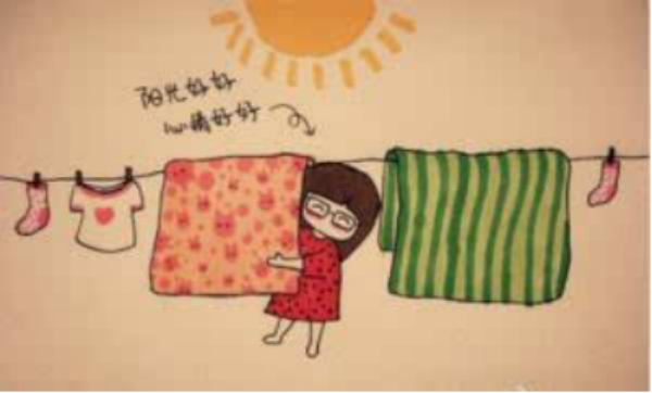 日光曝晒是利用日光中的热、干燥和紫外线的作用杀菌。对于一些大件不易清洗或蒸煮的织物类,如床垫、毛毯、被褥等;或一些怕湿怕热,不能浸泡消毒的书籍、玩具等可选择曝晒。