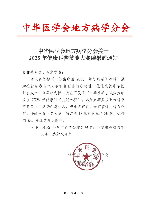 为深入贯彻落实《“健康中国2030”规划纲要》精神,扎实推进《健康中国行动(2019—2030年)》目标任务,积极落实《全国地方病防治巩固提升行动方案(2023—2025年)》中关于健康普及行动的具体要求,进一步激发社会各界参与地方病科普创作的积极性和创造性,中华医学会地方病学分会于2025年3月至6月组织举办了“中华医学会地方病学分会2025年健康科普技能大赛”。