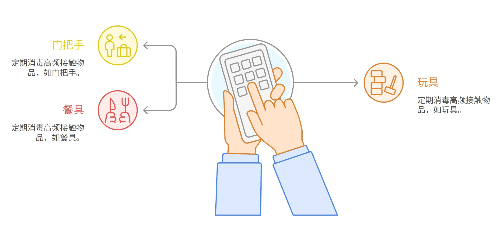 门把手、开关、遥控器、玩具这些孩子经常接触的物品,建议定期消毒,可以用75%酒精或稀释的消毒液擦拭。毛绒玩具可以定期清洗或阳光暴晒,塑料玩具用消毒湿巾擦拭即可。儿童餐具使用后及时清洗消毒。孩子也会接触的手机、平板屏幕,也可以定期用消毒湿巾擦一擦。