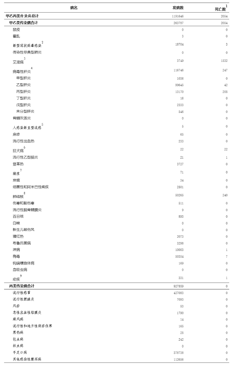 注:发病数与死亡数按照终审日期进行统计。1.通过传染病网络直报系统报告的死亡数据不作为中国传染病死因顺位依据。2.新型冠状病毒感染死亡病例包括新型冠状病毒感染导致呼吸功能衰竭死亡病例和基础疾病合并新型冠状病毒感染死亡病例。3.艾滋病死亡数是累计报告艾滋病病人在当月报告的全死因死亡数。4.病毒性肝炎的发病数、死亡数为甲型肝炎、乙型肝炎、丙型肝炎、丁型肝炎、戊型肝炎、未分型肝炎报告发病数、死亡数的合计。5.人感染新亚型流感包括的病原分型为H3N8、H5N1、H5N6、H7N4、H7N9、H9N2、H10N3、H10N5、H10N8、欧亚禽H1N1,以及发现的其他新亚型流感病毒感染。6.22例狂犬病死亡病例中,13例为当月发病,其余9例为往月发病。7.自2023年9月20日起,猴痘纳入乙类传染病管理。71例猴痘病例包含66例本土病例和5例输入病例。其中,66例本土病例均为Ⅱb亚分支;5例输入病例中,1例为Ib亚分支,4例为Ⅱb亚分支。8.自2019年5月1日起“结核性胸膜炎”归入肺结核分类统计,不再报告到“其他法定管理以及重点监测传染病”中。9.报告的疟疾病例均为输入病例。
