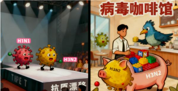 第二招:“灵魂互换”(抗原转换)!当人流感、禽流感病毒在猪这类“病毒咖啡馆”里相遇,它们一拍即合,直接把HA和NA基因交换了!结果, 一个全新的、谁都不认识的“超级新星”诞生了! 全人类都对它没有免疫力,它可不就迅速席卷全球,引发大流行了嘛!历史上的几次流感大流行,基本都是这么来的。