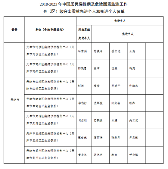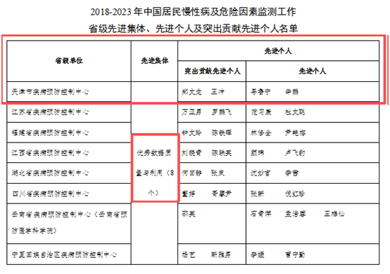 近日,中国疾病预防控制中心慢性非传染性疾病预防控制中心(以下简称“中国疾控中心慢病中心”)公布2018-2023年中国居民慢性病及危险因素监测工作总结结果,对参加2018-2023年中国居民慢性病及危险因素监测工作的各省级单位上报材料进行了综合审核,评选出先进集体和先进个人。中国居民慢性病及危险因素监测是在国家卫生健康委员会、国家疾病预防控制局和中国疾病预防控制中心的领导下由中国疾控中心慢病中心负责组织实施,定期开展的以我国成年常住人群为基础的大规模横断面调查,自2004年起已开展了七次现场调查,为我国慢性病防控政策制定、策略优化提供了坚实的数据支撑与科学依据。