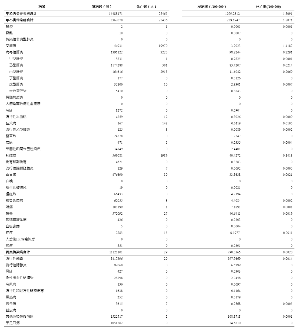 4.病毒性肝炎报告发病、死亡数为甲型肝炎、乙型肝炎、丙型肝炎、丁型肝炎、戊型肝炎和未分型肝炎的合计数。