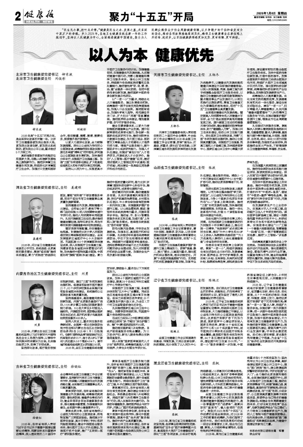 “民生无小事,枝叶总关情。”健康是民生之本、发展之基,关系到千家万户的幸福。步入2026年,各地卫生健康系统在新一年的工作规划中,坚持以人民健康为中心,全面推进健康中国建设,努力为人民群众提供全方位全周期健康保障,以只争朝夕的干劲和奋发有为的姿态,推动各项政策措施落到实处,确保卫生健康事业在新征程上开好局、起好步,让百姓健康获得感更加充实、更有保障、更可持续。