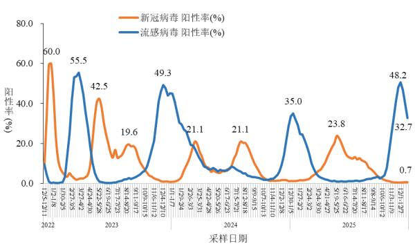 2025年第49周(12月1日-12月7日)至第52周(12月22日-12月28日),流感样病例新冠病毒阳性率处于低位,分别为0.5%、0.6%、0.7%、0.7%。见图4-2。
