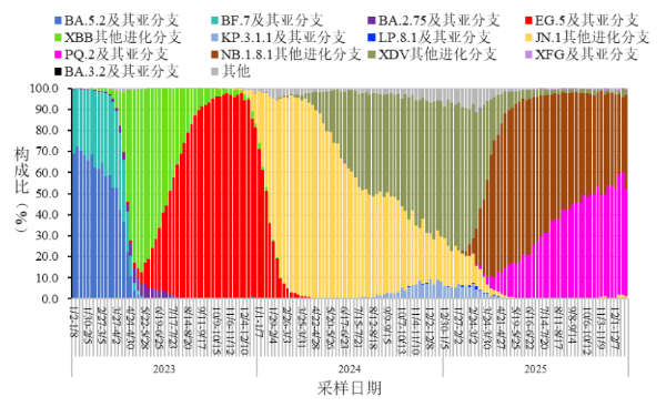 2025年12月1日-12月31日,全国31个省(自治区、直辖市)及新疆生产建设兵团共报送2879例本土病例新冠病毒基因组有效序列,均为奥密克戎变异株。主要流行株为NB.1.8.1及其亚分支。根据采样日期,第49周(12月1日-12月7日)至第52周(12月22日-12月28日)NB.1.8.1及其亚分支占比分别为97.0%、95.2%、93.8%、95.6%。见图5。