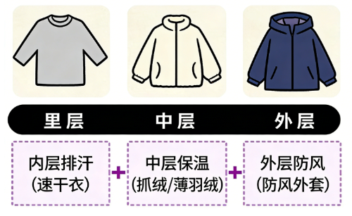 1.三层穿衣法:内层选速干衣负责排汗、中层用抓绒或薄羽绒锁温、外层搭防风外套抵御寒风,实现动态调节体温,便于进出室内时增减衣物。