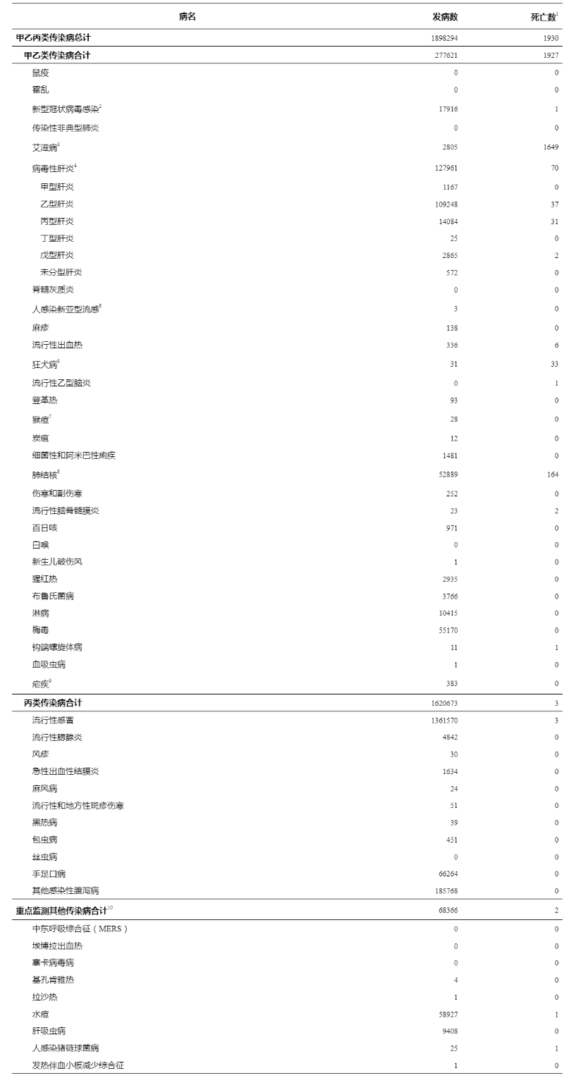 注:发病数与死亡数按照终审日期进行统计。1.通过传染病网络直报系统报告的死亡数据不作为中国传染病死因顺位依据。2.新型冠状病毒感染死亡病例包括新型冠状病毒感染导致呼吸功能衰竭死亡病例和基础疾病合并新型冠状病毒感染死亡病例。3.艾滋病死亡数是累计报告艾滋病病人在当月报告的全死因死亡数。4.病毒性肝炎的发病数、死亡数为甲型肝炎、乙型肝炎、丙型肝炎、丁型肝炎、戊型肝炎、未分型肝炎报告发病数、死亡数的合计。5.人感染新亚型流感包括的病原分型为H3N8、H5N1、H5N6、H7N4、H7N9、H9N2、H10N3、H10N5、H10N8、欧亚禽H1N1,以及发现的其他新亚型流感病毒感染。6.本月33例狂犬病死亡病例中,14例为当月发病,其余19例为往月发病。7.自2023年9月20日起,猴痘纳入乙类传染病管理。28例猴痘病例均为Ⅱb亚分支,其中5例为境外输入病例,23例为本土病例。8.自2019年5月1日起“结核性胸膜炎”归入肺结核分类统计,不再报告到“其他法定管理以及重点监测传染病”中。9.报告的疟疾病例均为境外输入病例。10.重点监测的其他传染病自2026年1月起纳入公布。