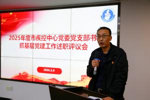 2026年2月9日,市疾控中心召开了2025年度党支部书记抓基层党建工作述职评议会。会议旨在进一步压实党支部党建工作责任,推动全面从严治党向纵深发展,提升中心党建工作整体水平。会议由市疾控中心党委书记杨洪利同志主持,市卫生健康委党建工作处副处长张伟同志到会指导,中心领导班子成员、全体党支部书记、“两代表一委员”以及基层党员干部群众代表参加会议。