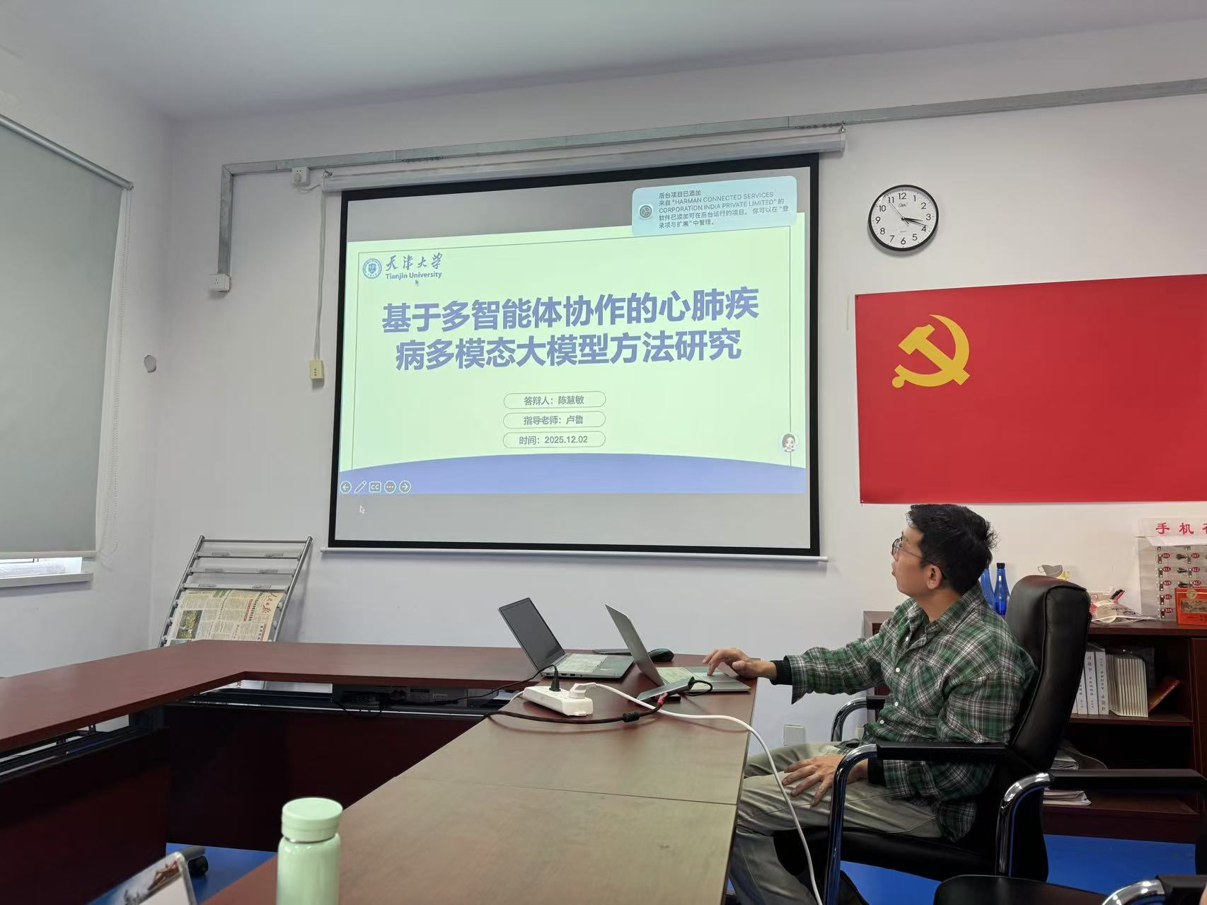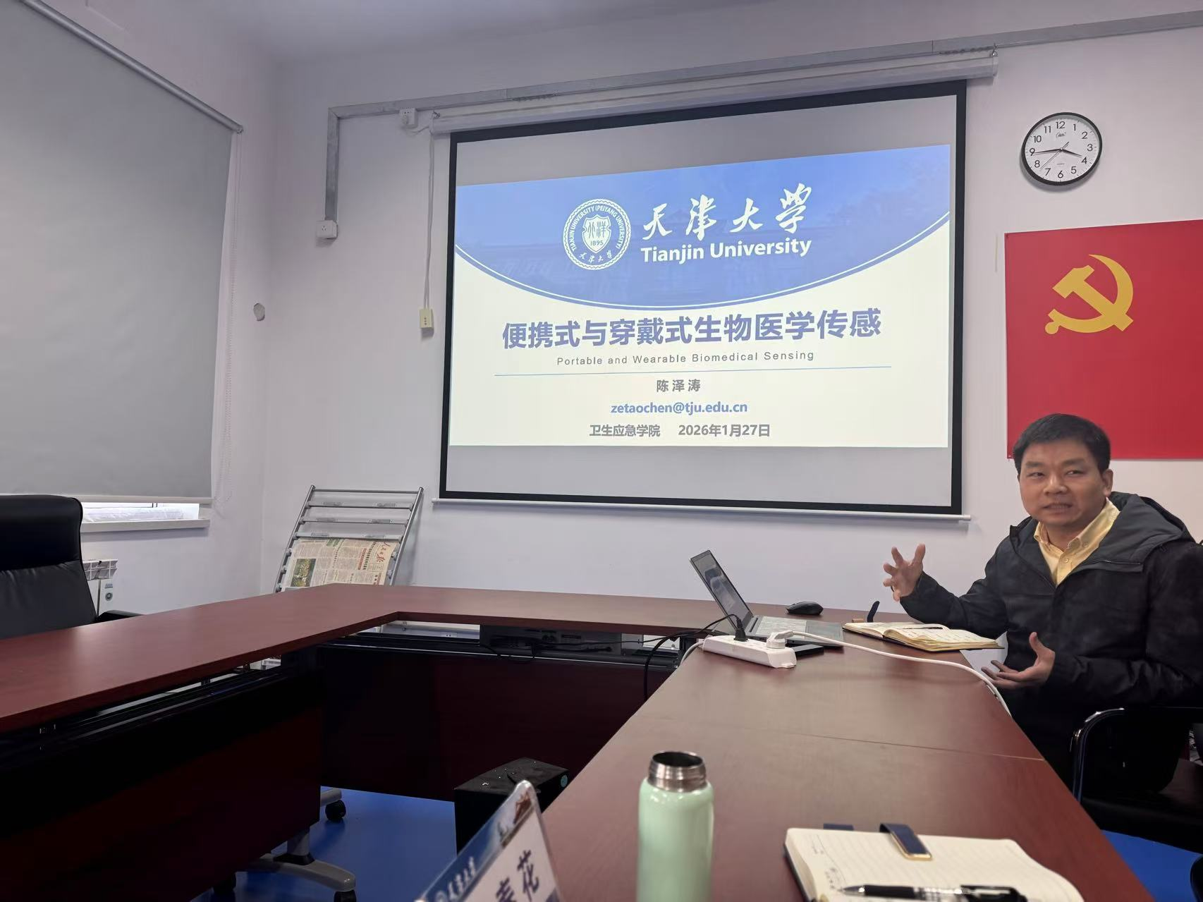 座谈会由天津大学卫生应急学院副院长赵艳梅主持。赵院长对结控中心来访表示热烈欢迎,并简要介绍了学院设立的背景及相关学科领域的科研优势、平台资源及科研成果。随即进入专题报告环节,陈泽涛、卢鲁二位教授分别就本学科建设成果进行了题为《便携式与穿戴式生物医学传感》、《基于多智能体协作的心肺疾病多模态大模型方法研究》的报告,市卫生健康系统“青年医学新锐”入选者、中心结核病控制研究室主任张国钦对中心整体情况及近年中心科研工作思路及做法进行了交流汇报。