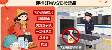 出行前,提前备好便携消毒用品,如可携带75%酒精棉片、消毒湿巾、小瓶装免洗洗手液,以及一次性床单、马桶垫、枕套。记住不要携带大瓶酒精,避免在乘坐高铁、飞机时安检受阻。