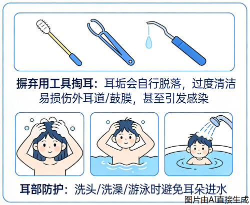 摒弃用棉签、发夹、挖耳勺等工具掏耳的习惯,耳垢会自行脱落,过度清洁易损伤外耳道和鼓膜,甚至引发感染。洗头、洗澡、游泳时做好耳部防护,避免耳朵进水,若进水可通过侧头单脚跳排出,切勿用手或棉签掏挖。
