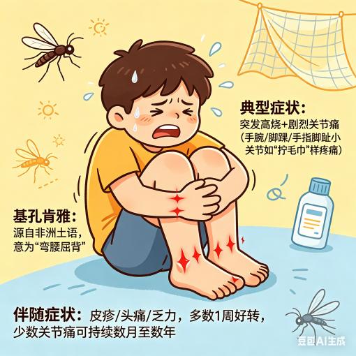 “基孔肯雅” 这个名字,源自非洲土语,本意是“弯腰屈背”。光听这个叫法,就能想象出那种疼到直不起身的难受劲儿。人感染之后,最典型的表现就是突发高烧,再加上剧烈的关节疼。尤其手腕、脚踝、手指、脚趾这些小关节,常常疼得像被反复拧过一样。除此之外,还可能出现皮疹、头疼、浑身没力气。大多数人一周左右就能好转,但也有少数人关节痛会持续几个月,甚至好几年,特别磨人。
