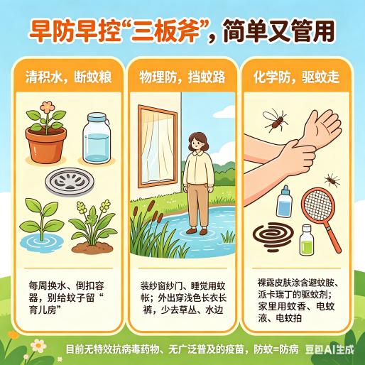 目前无特效抗病毒药物,也没有广泛普及的疫苗,想要远离感染,防止蚊虫叮咬,是唯一且最有效的手段,牢记这3个防控方法,简单又实用: